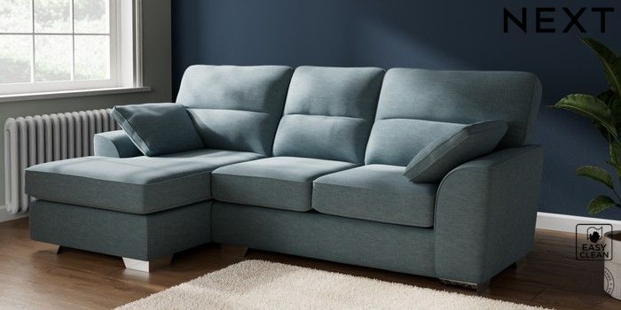 7.2.10 Stamford Highback Medium Sofa Chaise - Left Hand Fine Chenille Easy Clean Mid Blue Large Square Angle - Chrome Metal | Made Click here to use our website with more accessibility support, for example screen readers