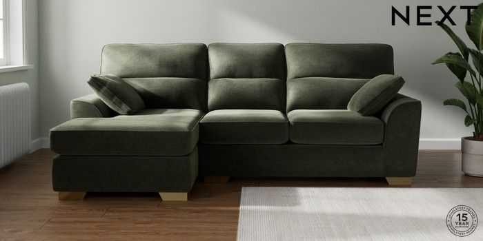 7.2.10 Stamford Highback Medium Sofa Chaise - Left Hand Luxe Chenille Mid Green Large Square Angle - Brushed Brass | Made Click here to use our website with more accessibility support, for example screen readers