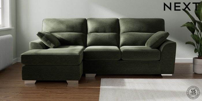 7.2.10 Stamford Highback Medium Sofa Chaise - Left Hand Luxe Chenille Mid Green Large Square Angle - Chrome Metal | Made Click here to use our website with more accessibility support, for example screen readers