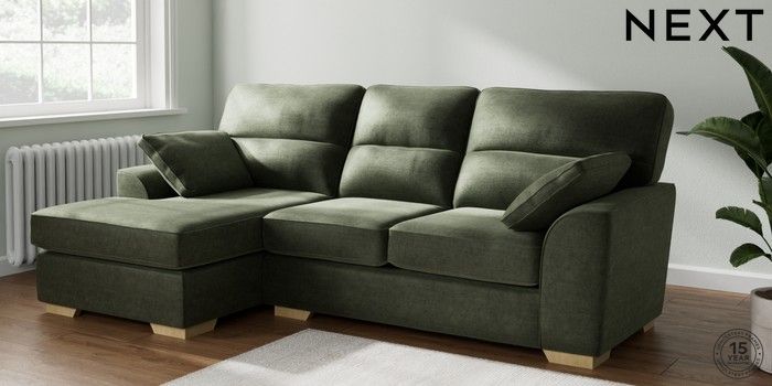 7.2.10 Stamford Highback Medium Sofa Chaise - Left Hand Luxe Chenille Mid Green Large Square Angle - Light | Made Click here to use our website with more accessibility support, for example screen readers