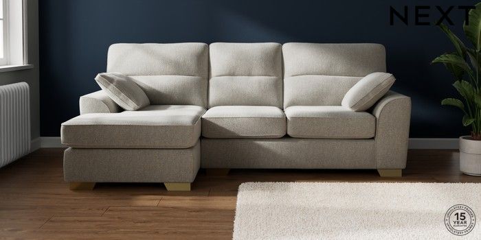 7.2.10 Stamford Highback Medium Sofa Chaise - Left Hand Multi Weave Light Blue Large Square Angle - Brushed Brass | Made Click here to use our website with more accessibility support, for example screen readers