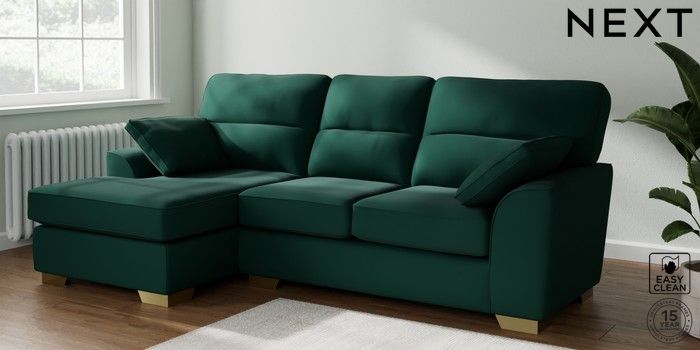 7.2.10 Stamford Highback Medium Sofa Chaise - Left Hand Plush Velvet Easy Clean Bottle Green Large Square Angle - Brushed Brass | Made Click here to use our website with more accessibility support, for example screen readers
