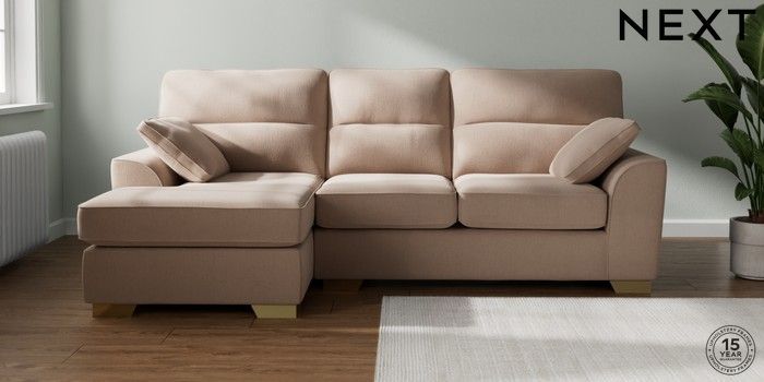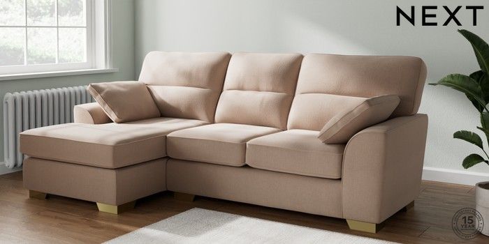 7.2.10 Stamford Highback Medium Sofa Chaise - Left Hand Relaxed Linen Look Mid Natural Large Square Angle - Brushed Brass | Made Click here to use our website with more accessibility support, for example screen readers