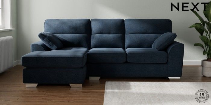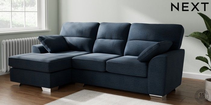 7.2.10 Stamford Highback Medium Sofa Chaise - Left Hand Ripple Chenille Dark Blue Large Square Angle - Chrome Metal | Made Click here to use our website with more accessibility support, for example screen readers