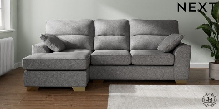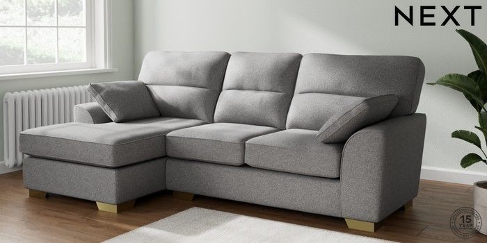 7.2.10 Stamford Highback Medium Sofa Chaise - Left Hand Studio Chenille Mid Grey Large Square Angle - Brushed Brass | Made Click here to use our website with more accessibility support, for example screen readers