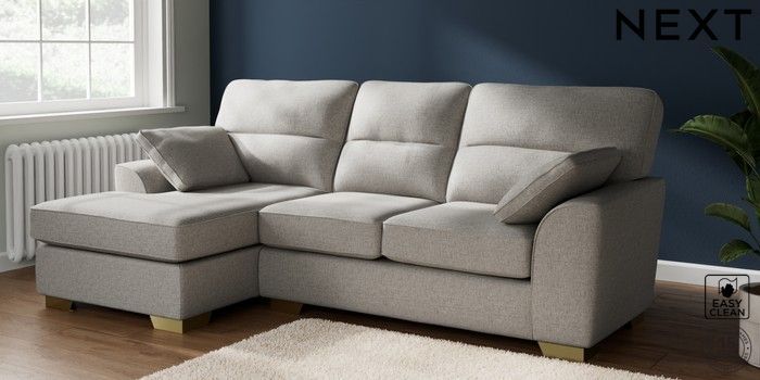 7.2.10 Stamford Highback Medium Sofa Chaise - Left Hand Woven Chenille Easy Clean Light Grey Large Square Angle - Brushed Brass | Made Click here to use our website with more accessibility support, for example screen readers