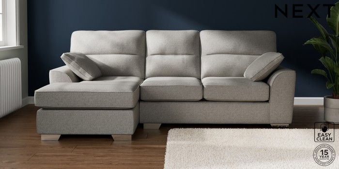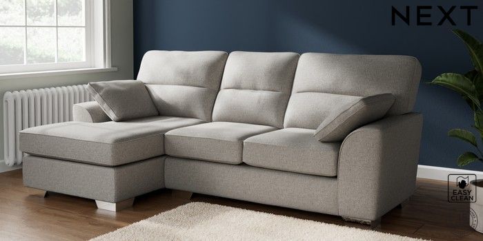 7.2.10 Stamford Highback Medium Sofa Chaise - Left Hand Woven Chenille Easy Clean Light Grey Large Square Angle - Chrome Metal | Made Click here to use our website with more accessibility support, for example screen readers