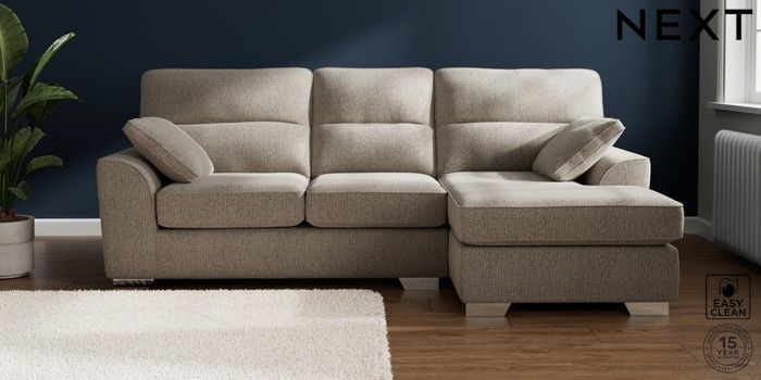 7.2.10 Stamford Highback Medium Sofa Chaise - Right Hand Chunky Boucle Easy Clean Dove Large Square Angle - Chrome Metal | Made Click here to use our website with more accessibility support, for example screen readers