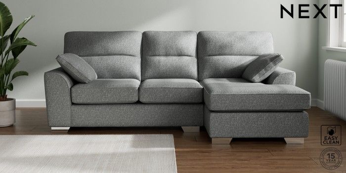 7.2.10 Stamford Highback Medium Sofa Chaise - Right Hand Chunky Boucle Easy Clean Mid Grey Large Square Angle - Chrome Metal | Made Click here to use our website with more accessibility support, for example screen readers