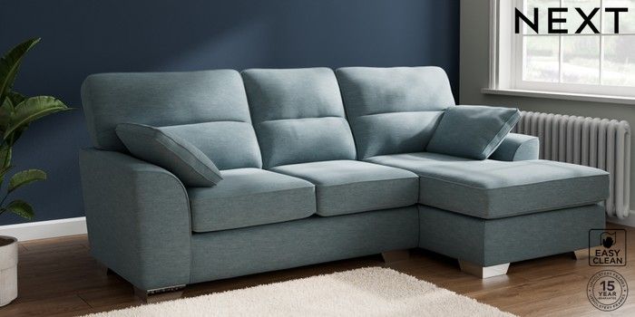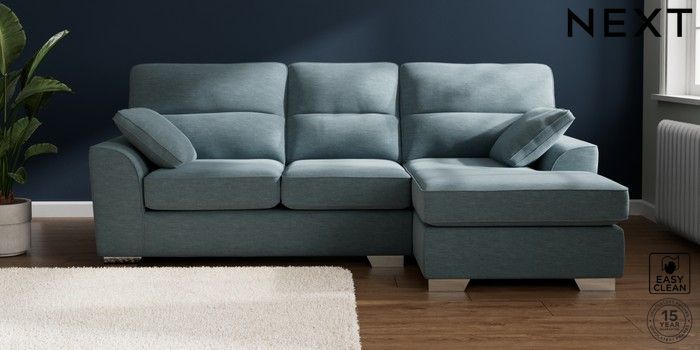 7.2.10 Stamford Highback Medium Sofa Chaise - Right Hand Fine Chenille Easy Clean Mid Blue Large Square Angle - Chrome Metal | Made Click here to use our website with more accessibility support, for example screen readers