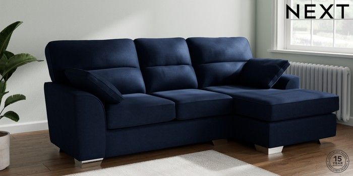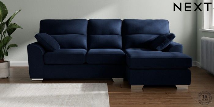 7.2.10 Stamford Highback Medium Sofa Chaise - Right Hand Luxe Chenille Navy Blue Large Square Angle - Chrome Metal | Made Click here to use our website with more accessibility support, for example screen readers
