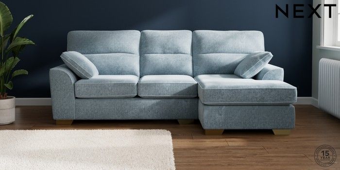 7.2.10 Stamford Highback Medium Sofa Chaise - Right Hand Plush Chenille Light Blue Large Square Angle - Brushed Brass | Made Click here to use our website with more accessibility support, for example screen readers