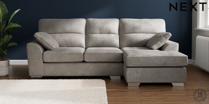 7.2.10 Stamford Highback Medium Sofa Chaise - Right Hand Plush Chenille Light Grey Large Square Angle - Chrome Metal | Made Click here to use our website with more accessibility support, for example screen readers