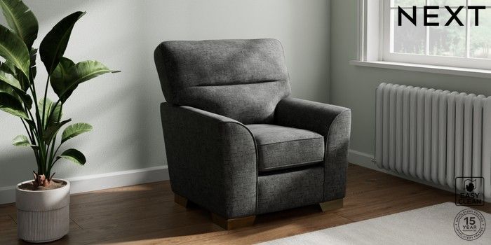 7.2.10 Stamford Highback Small Armchair Boucle Weave Easy Clean Charcoal Grey Square Angle - Brushed Brass | Made Click here to use our website with more accessibility support, for example screen readers