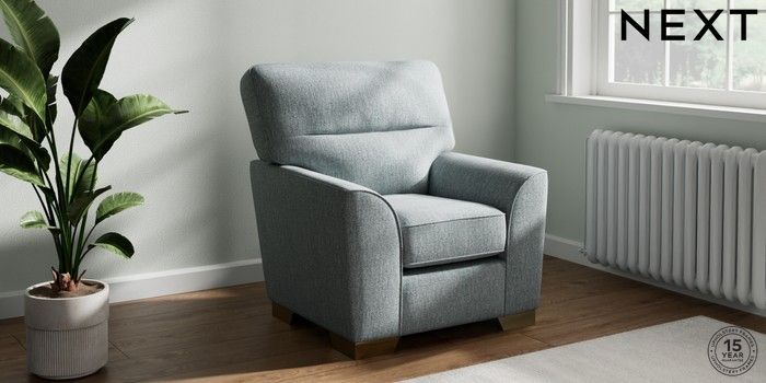 7.2.10 Stamford Highback Small Armchair Chunky Weave Mid Blue Square Angle - Brushed Brass | Made Click here to use our website with more accessibility support, for example screen readers