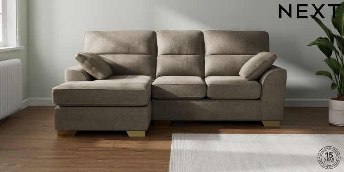 7.2.10 Stamford Highback Small Sofa Chaise - Left Hand Cotswold Chenille Mid Mink Brown Large Square Angle - Brushed Brass | Made Click here to use our website with more accessibility support, for example screen readers
