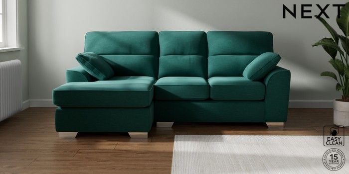 7.2.10 Stamford Highback Small Sofa Chaise - Left Hand Fine Chenille Easy Clean Dark Juniper Green Large Square Angle - Chrome Metal | Made Click here to use our website with more accessibility support, for example screen readers