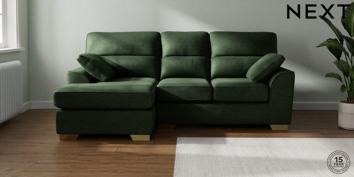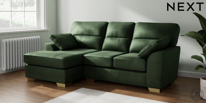 7.2.10 Stamford Highback Small Sofa Chaise - Left Hand Luxe Chenille Dark Green Large Square Angle - Brushed Brass | Made Click here to use our website with more accessibility support, for example screen readers