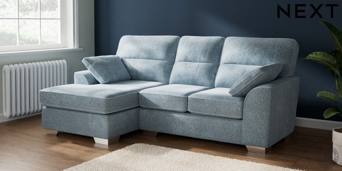 7.2.10 Stamford Highback Small Sofa Chaise - Left Hand Plush Chenille Light Blue Large Square Angle - Chrome Metal | Made Click here to use our website with more accessibility support, for example screen readers