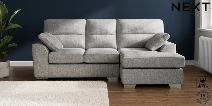 7.2.10 Stamford Highback Small Sofa Chaise - Right Hand Chunky Boucle Easy Clean Light Grey Large Square Angle - Chrome Metal | Made Click here to use our website with more accessibility support, for example screen readers