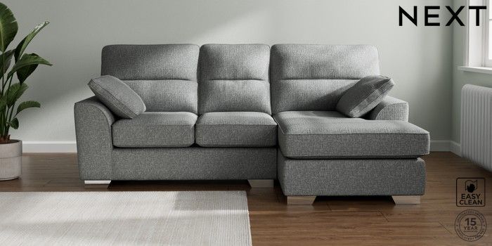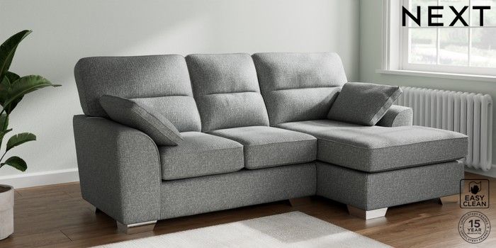7.2.10 Stamford Highback Small Sofa Chaise - Right Hand Chunky Boucle Easy Clean Mid Grey Large Square Angle - Chrome Metal | Made Click here to use our website with more accessibility support, for example screen readers