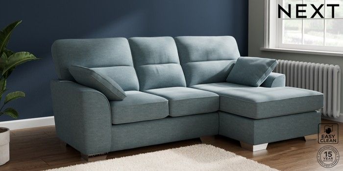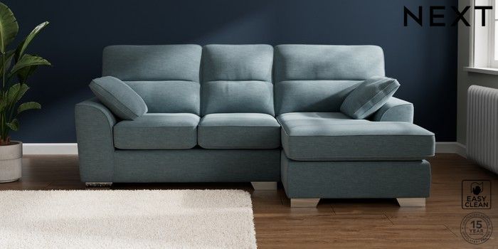 7.2.10 Stamford Highback Small Sofa Chaise - Right Hand Fine Chenille Easy Clean Mid Blue Large Square Angle - Chrome Metal | Made Click here to use our website with more accessibility support, for example screen readers