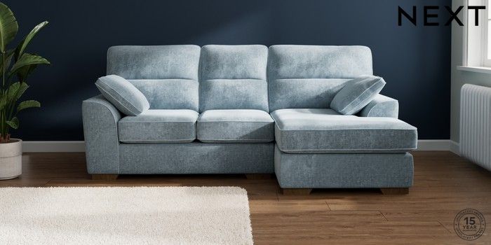 7.2.10 Stamford Highback Small Sofa Chaise - Right Hand Plush Chenille Light Blue Large Square Angle - Mid | Made Click here to use our website with more accessibility support, for example screen readers