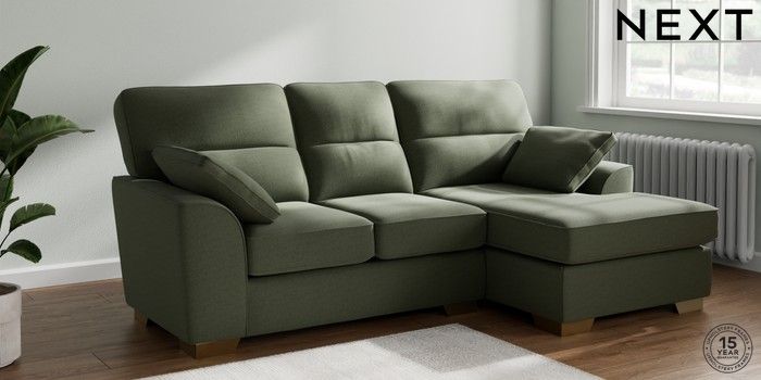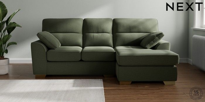 7.2.10 Stamford Highback Small Sofa Chaise - Right Hand Relaxed Linen Look Dark Green Large Square Angle - Brushed Brass | Made Click here to use our website with more accessibility support, for example screen readers
