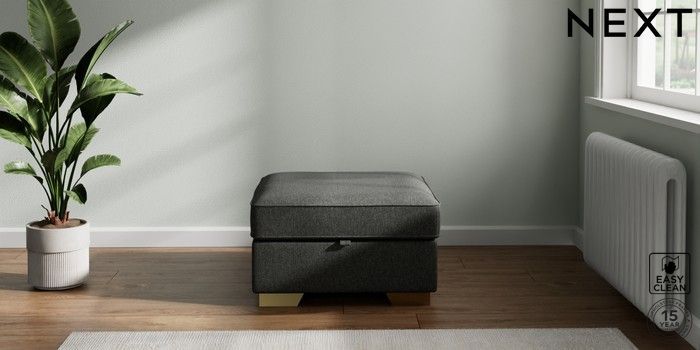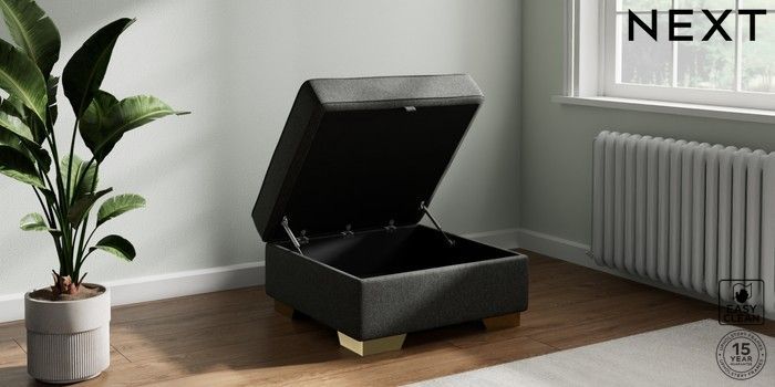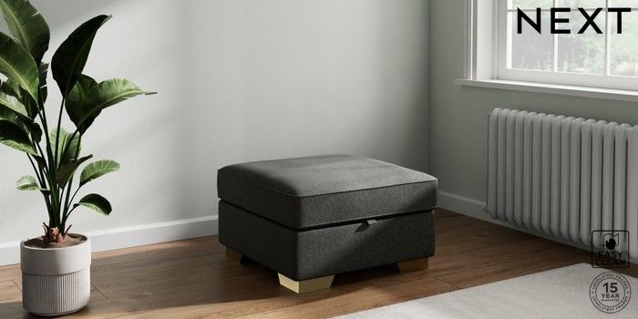 7.2.10 Stamford Highback Storage Footstool Tweedy Blend Easy Clean Charcoal Grey Square Angle - Brushed Brass | Made Click here to use our website with more accessibility support, for example screen readers