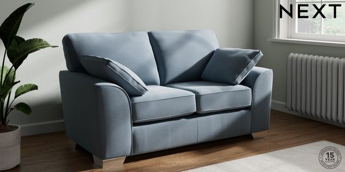 7.2.10 Stamford 2 Seater Small Sofa Relaxed Linen Look Mid Blue Large Square Angle - Chrome Metal | Made Click here to use our website with more accessibility support, for example screen readers