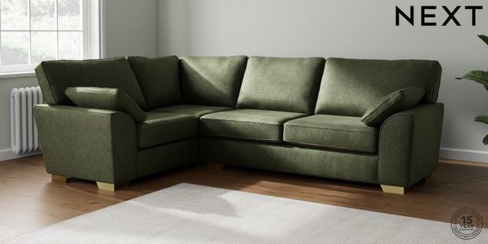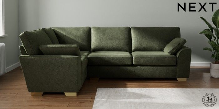 7.2.10 Stamford Large Corner Sofa - Left Hand Boucle Chenille Dark Moss Green Large Square Angle - Brushed Brass | Made Click here to use our website with more accessibility support, for example screen readers
