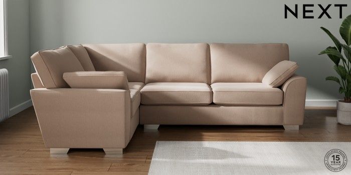 7.2.10 Stamford Large Corner Sofa - Left Hand Relaxed Linen Look Mid Natural Large Square Angle - Chrome Metal | Made Click here to use our website with more accessibility support, for example screen readers