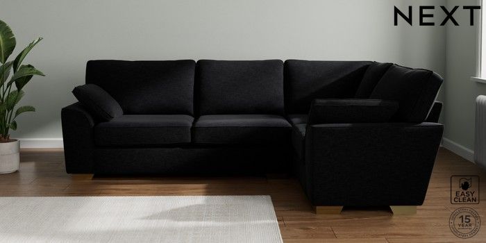 7.2.10 Stamford Large Corner Sofa - Right Hand Fine Chenille Easy Clean Black Large Square Angle - Brushed Brass | Made Click here to use our website with more accessibility support, for example screen readers