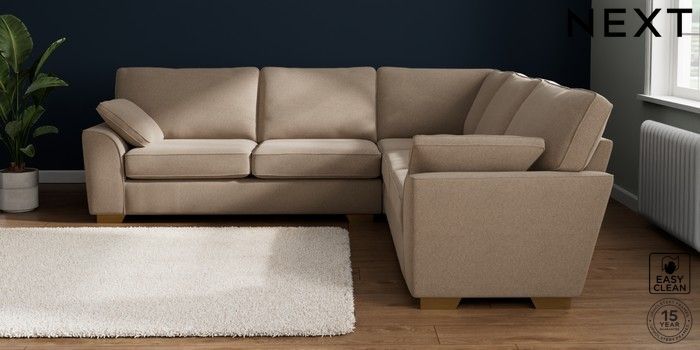 7.2.10 Stamford Large Corner Sofa - Universal Tweedy Blend Easy Clean Light Dove Natural Large Square Angle - Brushed Brass | Made Click here to use our website with more accessibility support, for example screen readers