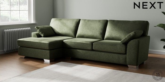 7.2.10 Stamford Large Sofa Chaise - Left Hand Boucle Chenille Dark Moss Green Large Square Angle - Chrome Metal | Made Click here to use our website with more accessibility support, for example screen readers