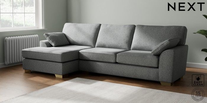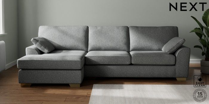 7.2.10 Stamford Large Sofa Chaise - Left Hand Chunky Boucle Easy Clean Mid Grey Large Square Angle - Brushed Brass | Made Click here to use our website with more accessibility support, for example screen readers