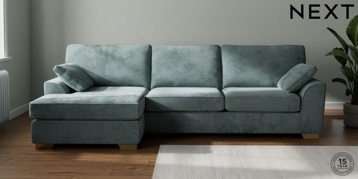 7.2.10 Stamford Large Sofa Chaise - Left Hand Chunky Chenille Light Teal Green Large Square Angle - Brushed Brass | Made Click here to use our website with more accessibility support, for example screen readers