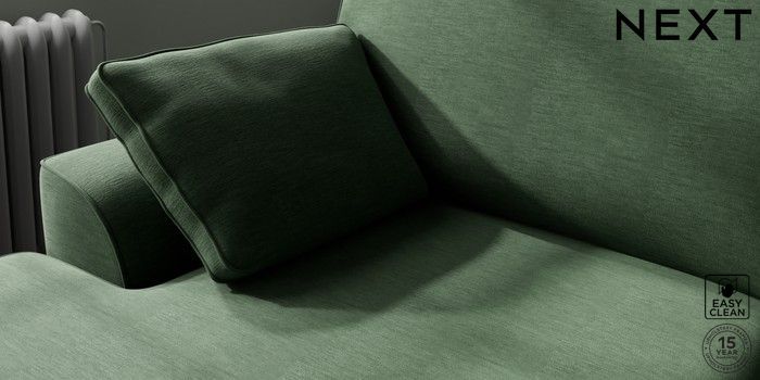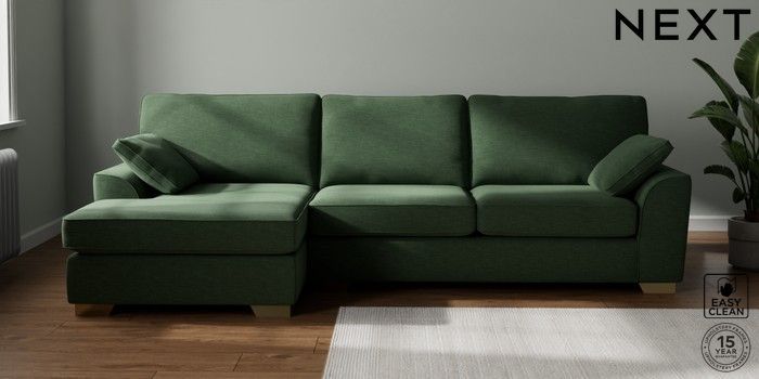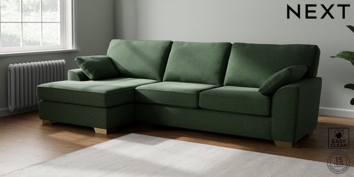 7.2.10 Stamford Large Sofa Chaise - Left Hand Fine Chenille Easy Clean Mid Khaki Green Large Square Angle - Brushed Brass | Made Click here to use our website with more accessibility support, for example screen readers