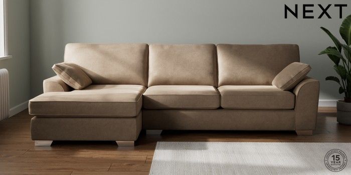 7.2.10 Stamford Large Sofa Chaise - Left Hand Luxe Chenille Mid Camel Beige Large Square Angle - Chrome Metal | Made Click here to use our website with more accessibility support, for example screen readers