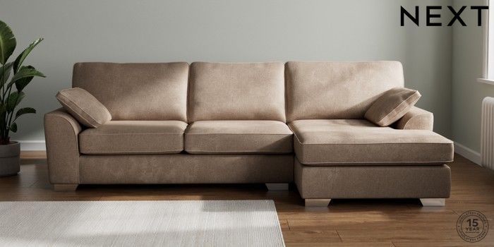7.2.10 Stamford Large Sofa Chaise - Right Hand Plush Chenille Mid Natural Large Square Angle - Chrome Metal | Made Click here to use our website with more accessibility support, for example screen readers