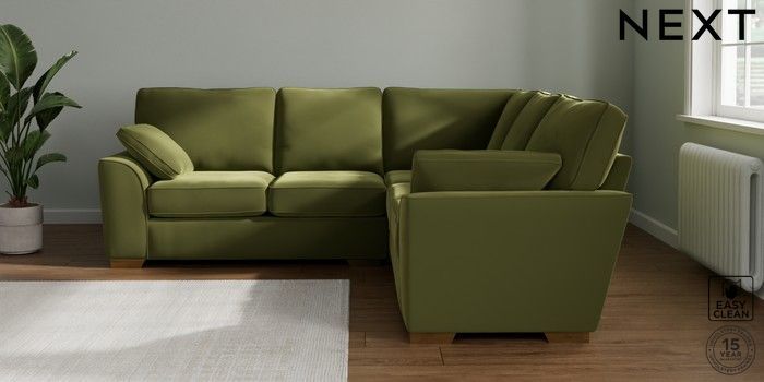7.2.10 Stamford Medium Corner Sofa - Universal Plush Velvet Easy Clean Mid Olive Green Large Square Angle - Brushed Brass | Made Click here to use our website with more accessibility support, for example screen readers