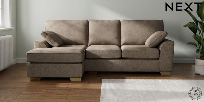 7.2.10 Stamford Medium Sofa Chaise - Left Hand Chunky Weave Dark Natural Large Square Angle - Brushed Brass | Made Click here to use our website with more accessibility support, for example screen readers