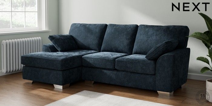 7.2.10 Stamford Medium Sofa Chaise - Left Hand Distressed Velour Midnight Blue Large Square Angle - Chrome Metal | Made Click here to use our website with more accessibility support, for example screen readers