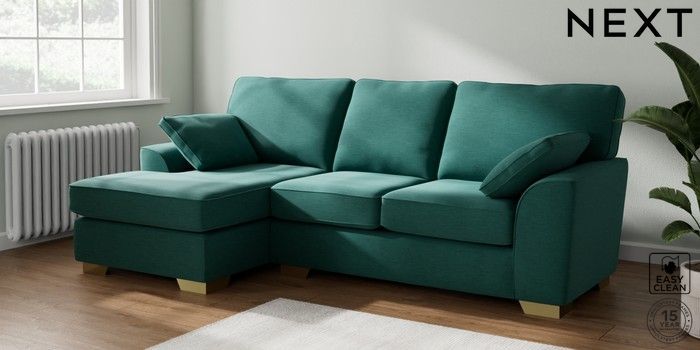 7.2.10 Stamford Medium Sofa Chaise - Left Hand Fine Chenille Easy Clean Dark Juniper Green Large Square Angle - Brushed Brass | Made Click here to use our website with more accessibility support, for example screen readers