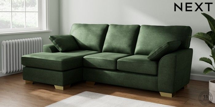 7.2.10 Stamford Medium Sofa Chaise - Left Hand Luxe Chenille Dark Green Large Square Angle - Brushed Brass | Made Click here to use our website with more accessibility support, for example screen readers