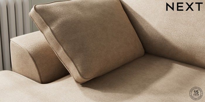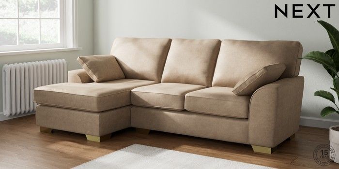 7.2.10 Stamford Medium Sofa Chaise - Left Hand Luxe Chenille Mid Camel Beige Large Square Angle - Brushed Brass | Made Click here to use our website with more accessibility support, for example screen readers