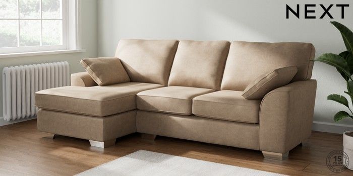 7.2.10 Stamford Medium Sofa Chaise - Left Hand Luxe Chenille Mid Camel Beige Large Square Angle - Chrome Metal | Made Click here to use our website with more accessibility support, for example screen readers