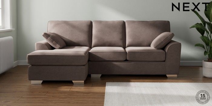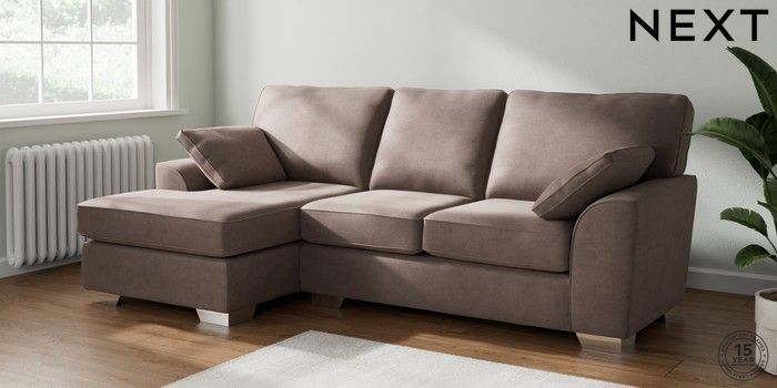 7.2.10 Stamford Medium Sofa Chaise - Left Hand Luxe Chenille Mink Brown Large Square Angle - Chrome Metal | Made Click here to use our website with more accessibility support, for example screen readers