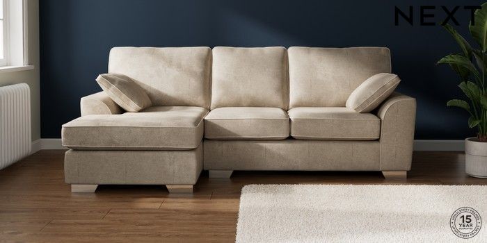 7.2.10 Stamford Medium Sofa Chaise - Left Hand Plush Chenille Light Natural Large Square Angle - Chrome Metal | Made Click here to use our website with more accessibility support, for example screen readers