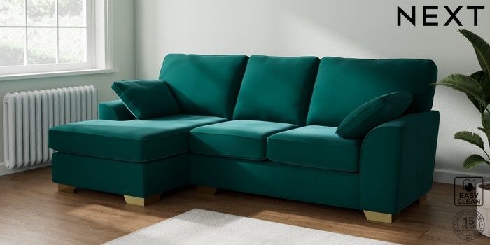 7.2.10 Stamford Medium Sofa Chaise - Left Hand Plush Velvet Easy Clean Juniper Green Large Square Angle - Brushed Brass | Made Click here to use our website with more accessibility support, for example screen readers